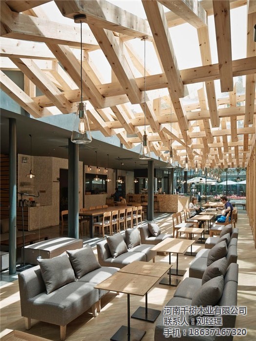 且新增的木梁在原有的鋼梁結(jié)構(gòu)之間交織穿梭,形成豐富有層次的光影效果,尤其是在天氣晴好的時候,體驗感更為直接。對于空間區(qū)域的分割,設(shè)計團(tuán)隊也著手從天花板部分來創(chuàng)造。比如前述提到的主要的編織木梁結(jié)構(gòu),其下方的空間寬敞明亮,更適合于那些喜愛沐浴在陽光或自然天光之下的客人們。而靠近建筑內(nèi)部的空間,在灰黑色的天花板映襯之下,則要顯得沉穩(wěn)、私密一些,顯然更適合那些需要安靜空間的客人們。